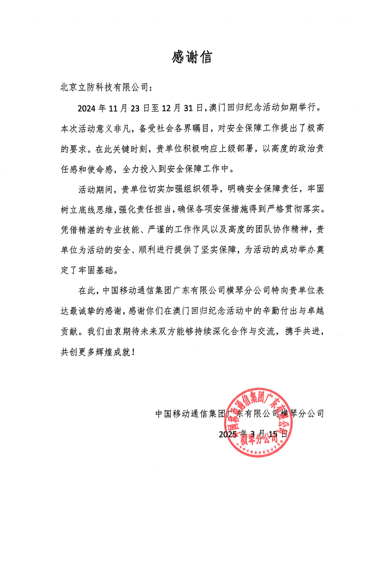 2024年12月31日,為期一個多月的澳門回歸祖國紀念系列活動在珠江口畔圓滿落幕。作為本次活動的重要技術(shù)保障單位,北京立防科技有限公司憑借卓越的技術(shù)實力、嚴謹?shù)墓ぷ髯黠L和高度的責任感,為這一備受矚目的國家級慶典提供了全方位的安全保障,贏得了主辦方的高度贊譽。more -